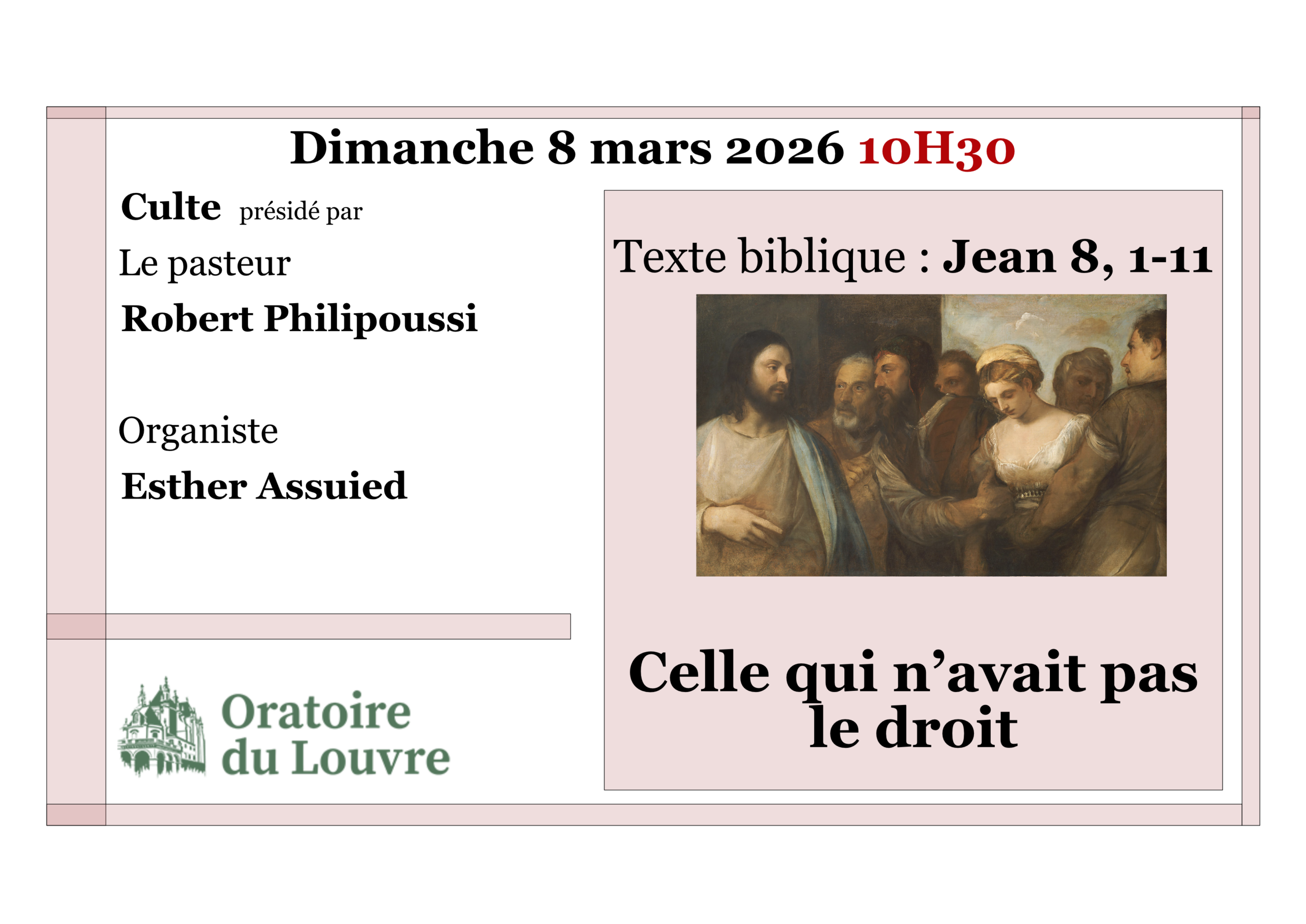 Le dimanche 8 mars, c’est le pasteur Philipoussi qui présidera le culte, à 10H30, au temple de l’Oratoire du Louvre