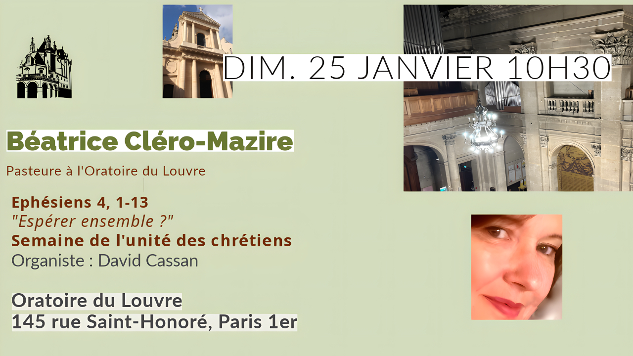 Dimanche prochain, le 25 janvier, la pasteure Beatrice Clero-Mazire présidera le culte au temple de l’Oratoire du Louvre, à 10H30