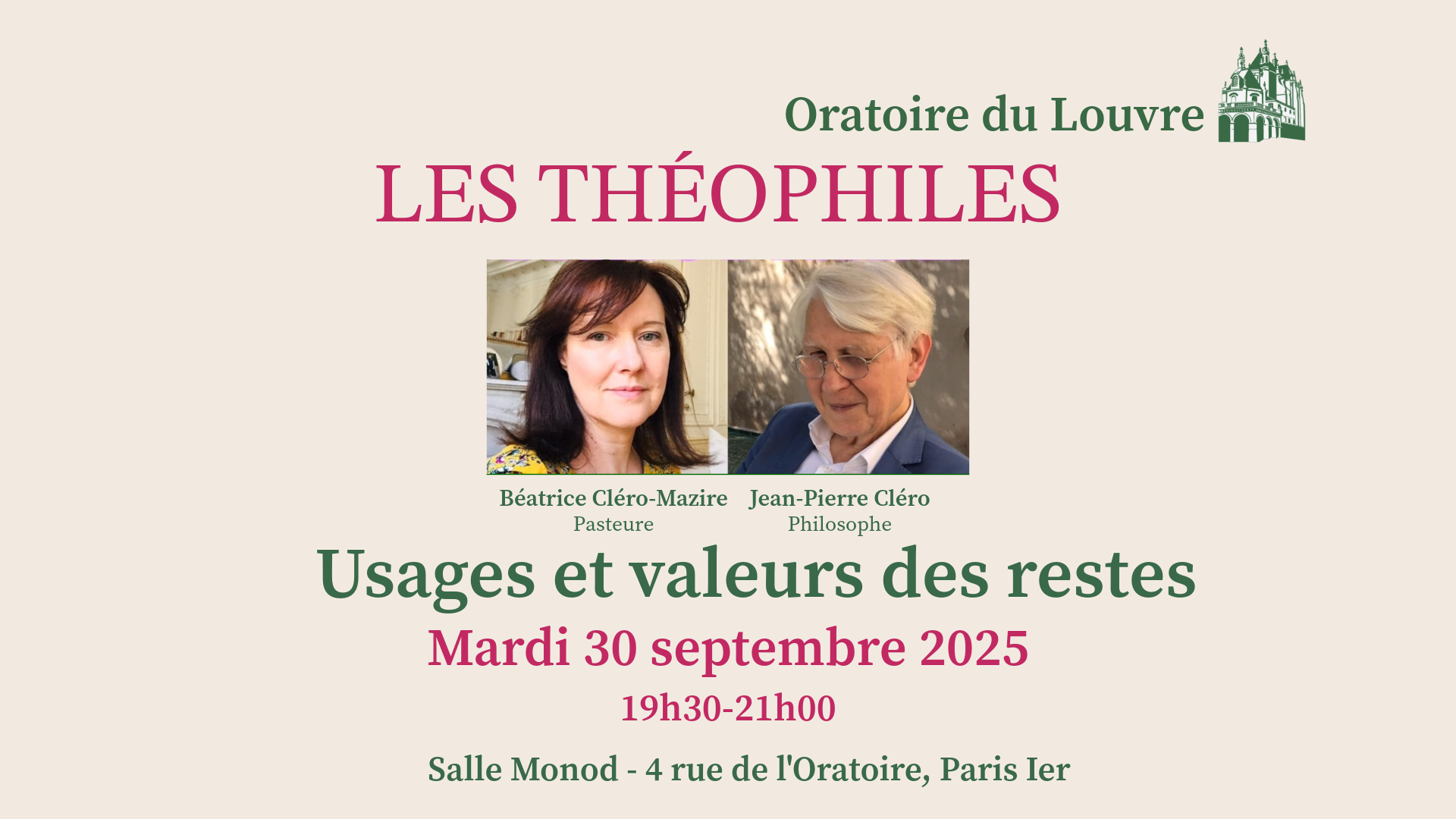 Dans la lignée des soirées « théophiles » organisées depuis 2018-2019 par Jean-Pierre Cléro, professeur émérite de philosophie, et la Pasteure Béatrice Cléro-Mazire, des rencontres seront organisées à trois voix avec France Farago, professeure de philosophie, en 2024-2025 selon le même concept : un thème, des textes, deux approches en dialogue, l’une biblique, l’autre philosophique.