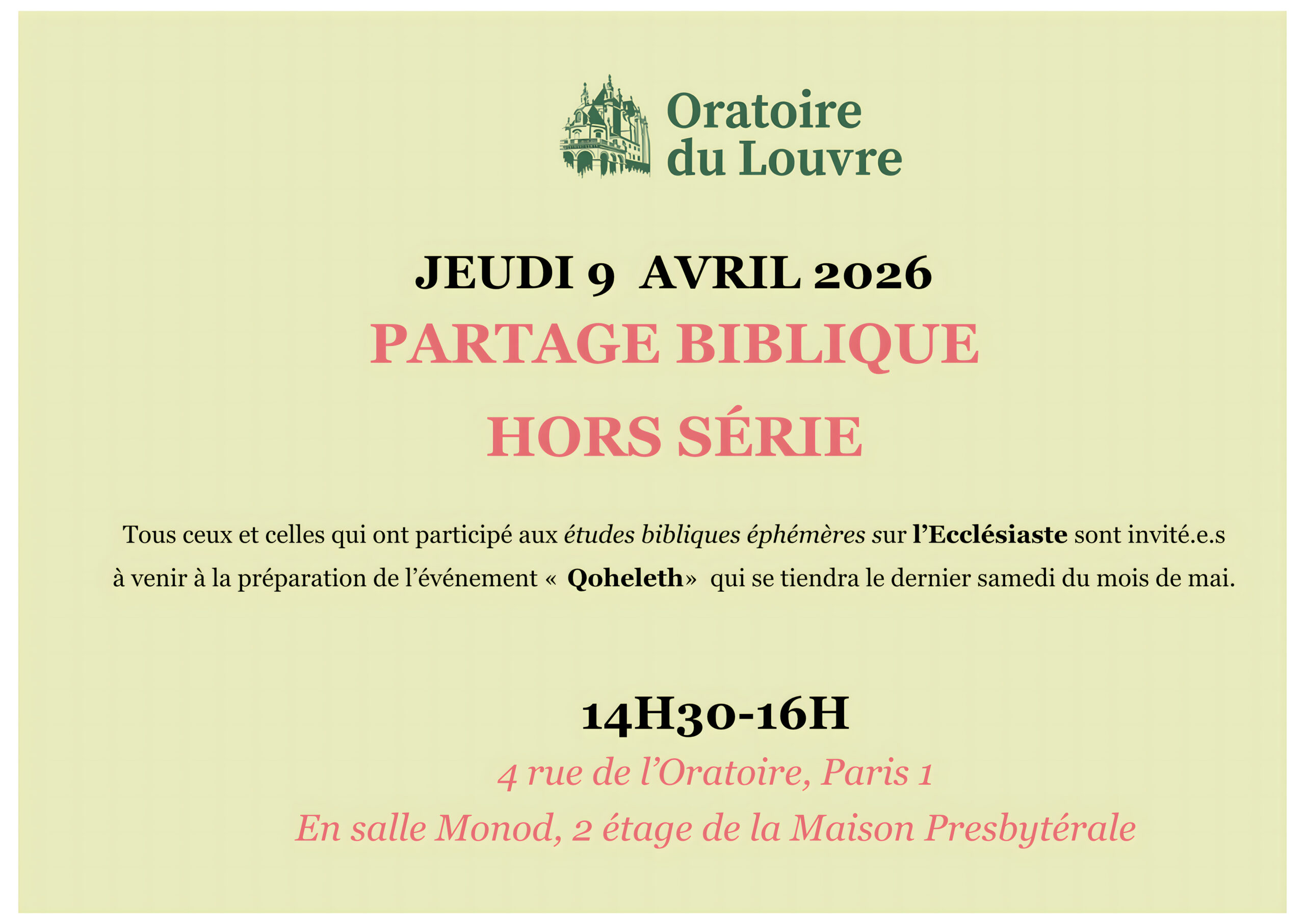 Tous ceux et celles qui ont participé aux études bibliques " éphémères" sur l'Ecclésiaste, sont invité.e.s à cette séance exceptionnelle destinée à préparer ensemble l'événement public "QOHELET" qui aura lieu le dernier samedi de mai .